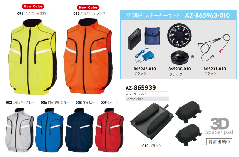 空調服ベスト特別価格5,300円、スペーサーパッド特別価格2,600円、スターターキット特別価格13,600円円